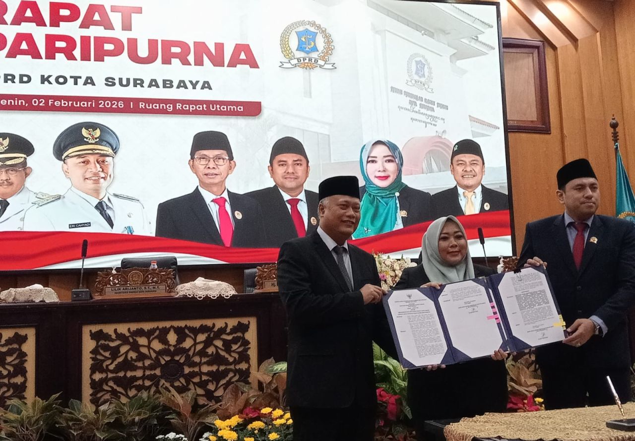 abadinews.id,Surabaya–Dewan Perwakilan Rakyat Daerah (DPRD) Kota Surabaya bersama Wali Kota Surabaya secara resmi menyetujui dan menetapkan sejumlah Rancangan Peraturan Daerah (Raperda) menjadi Peraturan Daerah (Perda) dalam Rapat Paripurna DPRD Kota Surabaya. Penetapan ini merupakan hasil rangkaian pembahasan intensif yang melibatkan Badan Pembentukan Peraturan Daerah (Bapemperda), Panitia Khusus (Pansus), serta pandangan dan persetujuan seluruh fraksi DPRD.Senin(2/2/26)