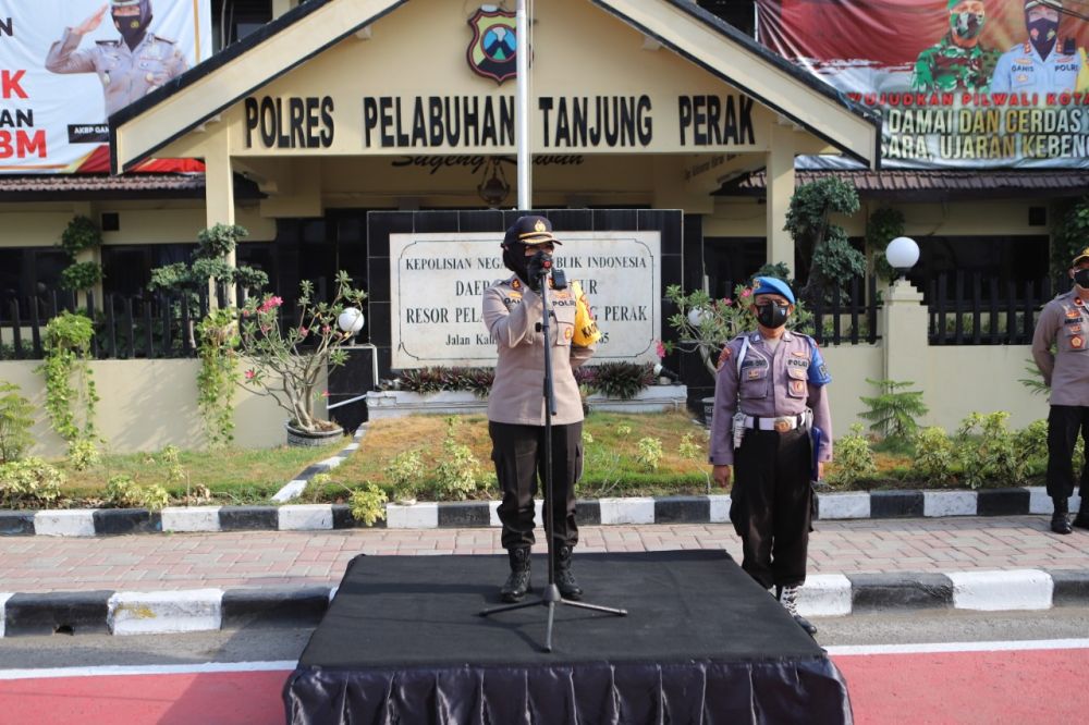 Kapolres mengecek seluruh persiapan personil dan kesiapan sarana dan prasarananya, bertempat di Halaman depan Mapolres Pelabuhan Tanjung Perak.